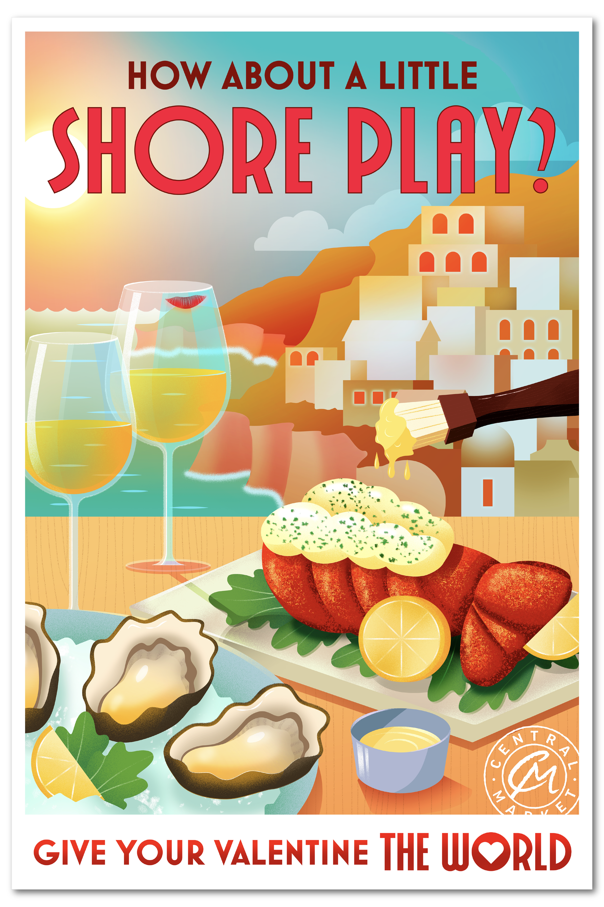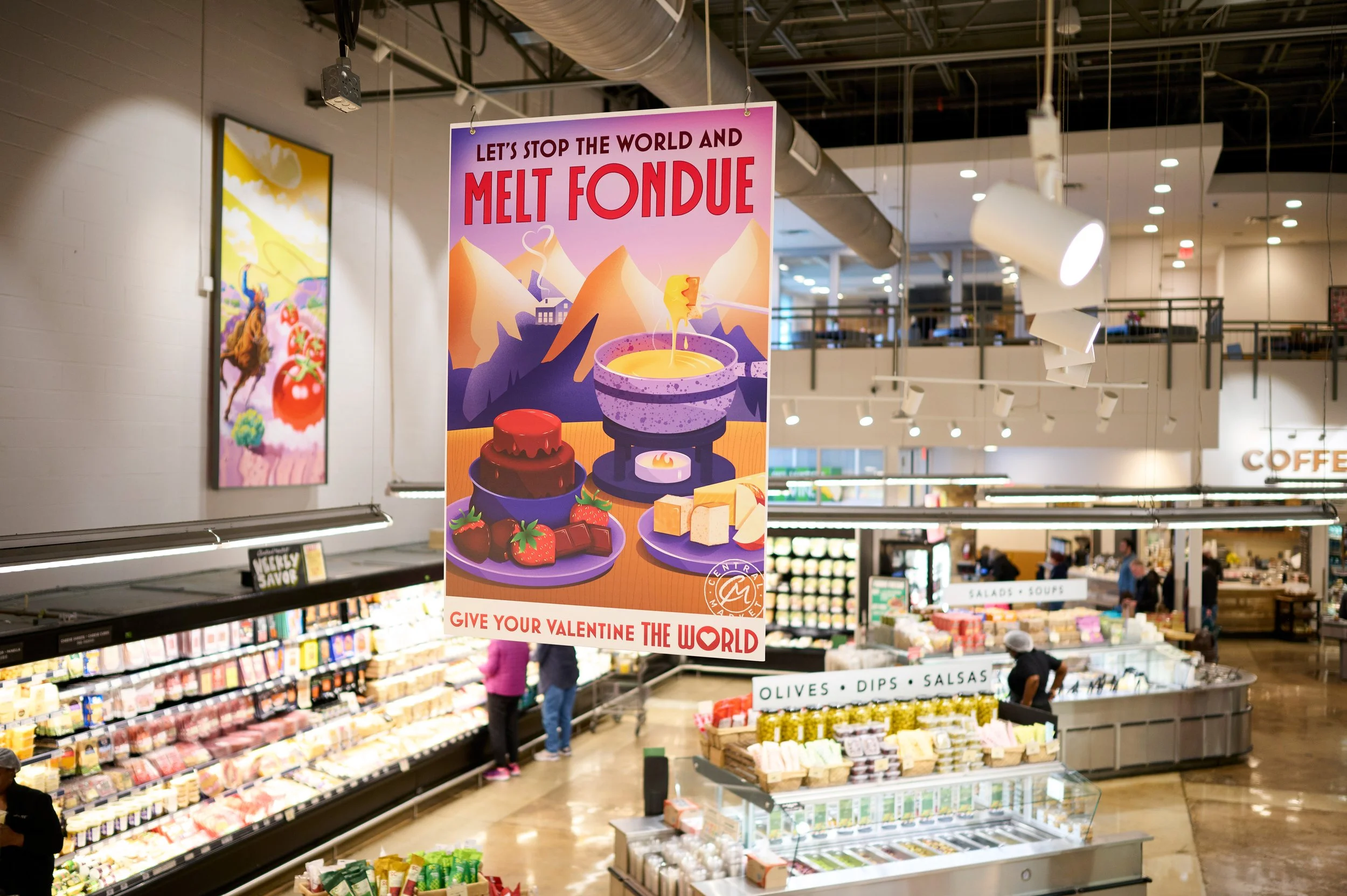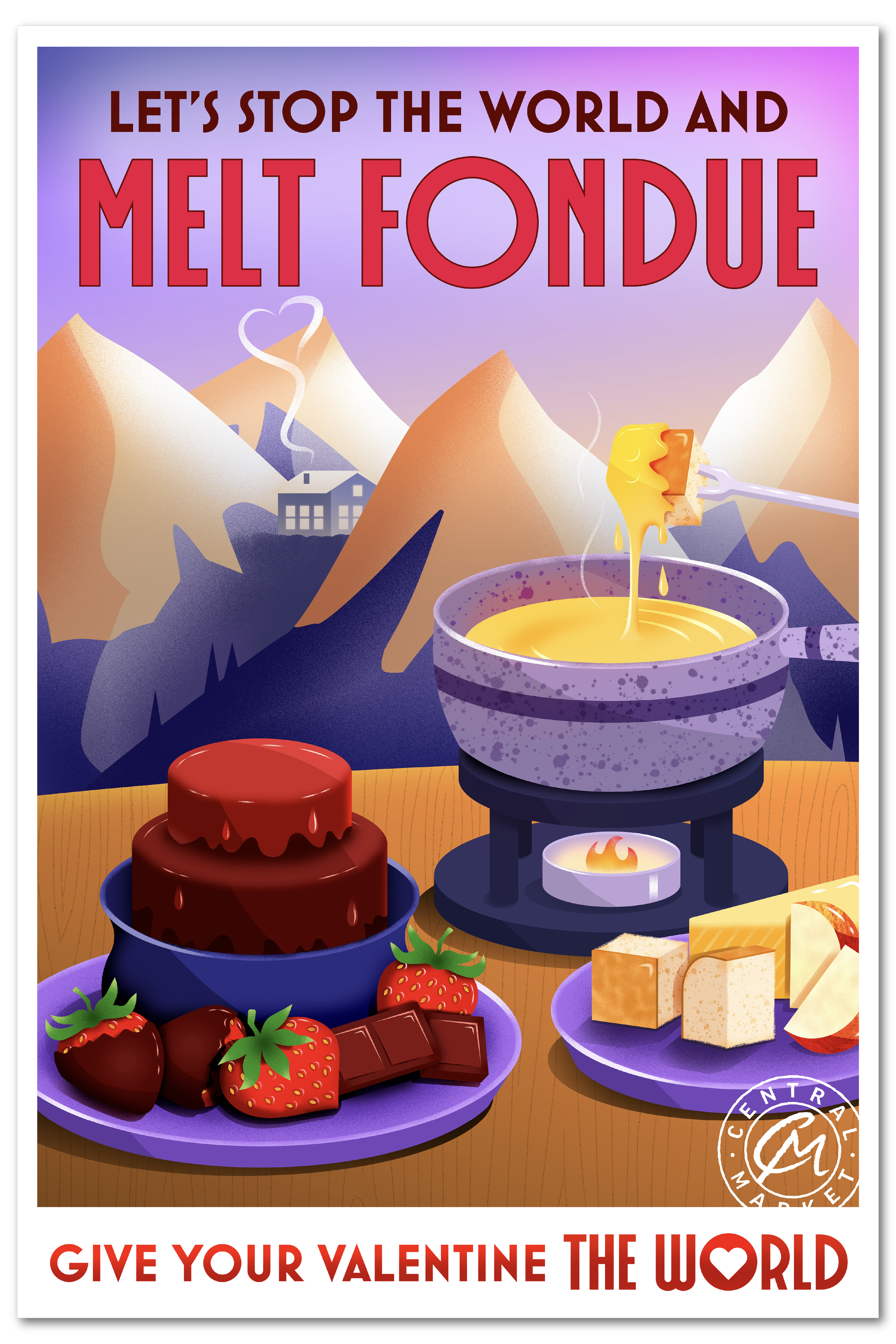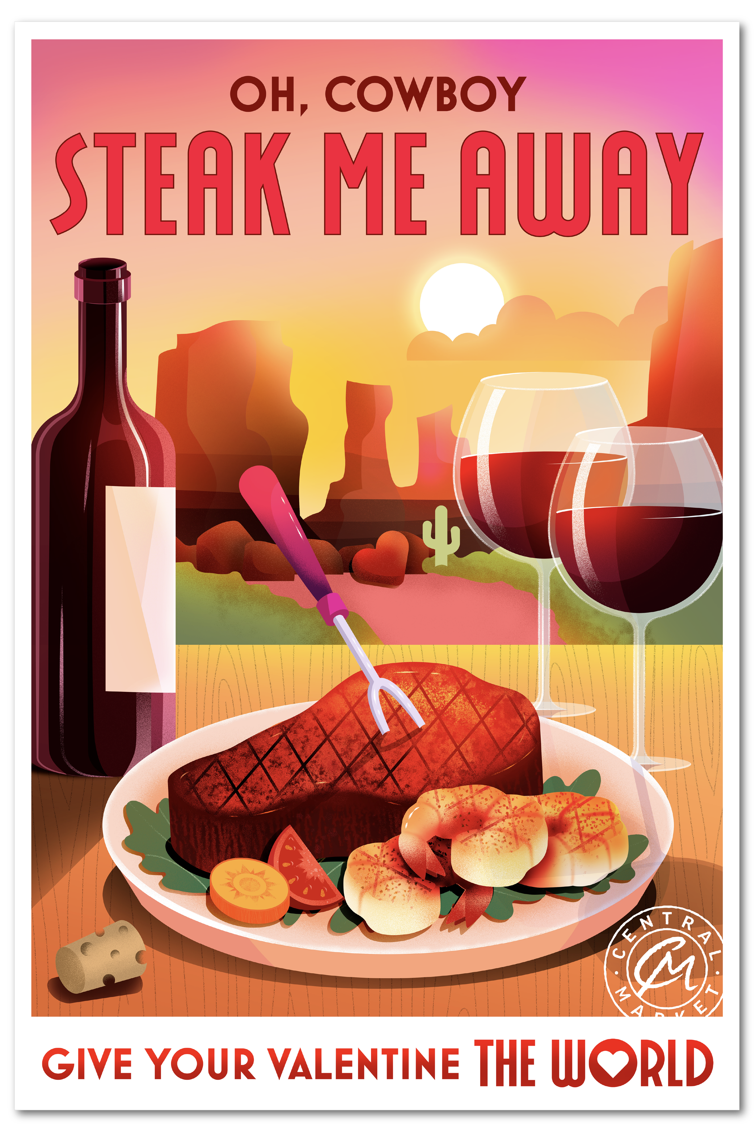Central Market, a gourmet grocery store, is a Texas treasure, but for their 2025 Valentine’s Day event, they wanted to take their customers on a culinary journey around the world. Taking inspiration from vintage travel posters, I created the primary artwork for this event and worked with the team at Trace Element to build out the various pieces of collateral.